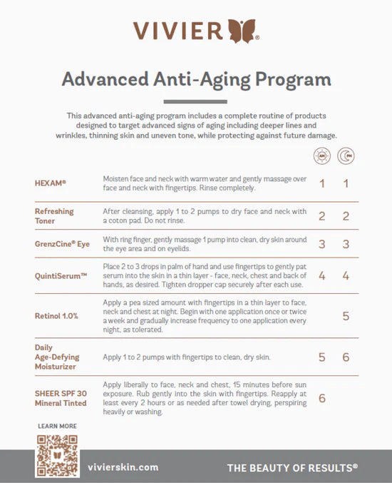 This Advanced Anti-Aging Program includes a complete routine of products designed to target advanced signs of aging including deeper lines and wrinkles, thinning skin and uneven tone, while protecting against future damage.