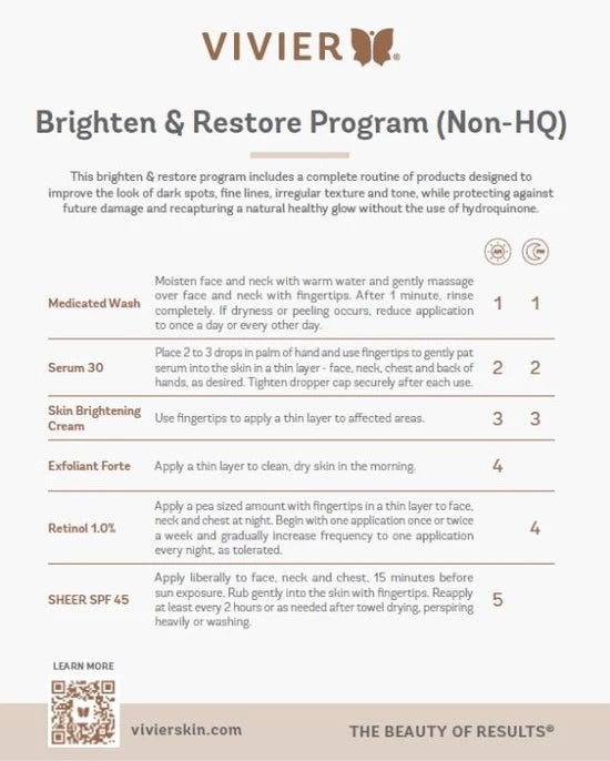 This Brighten & Restore Program includes a complete routine of products designed to improve the look of dark spots, fine lines, irregular texture and tone, while protecting against future damage and recapturing a natural healthy glow without the use of hydroquinone.