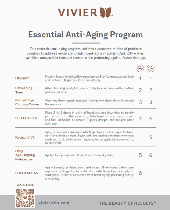 This Essential Anti-Aging Program includes a complete routine of products designed to address moderate to significant signs of aging including fine lines, wrinkles, uneven skin tone and texture while protecting against future damage.